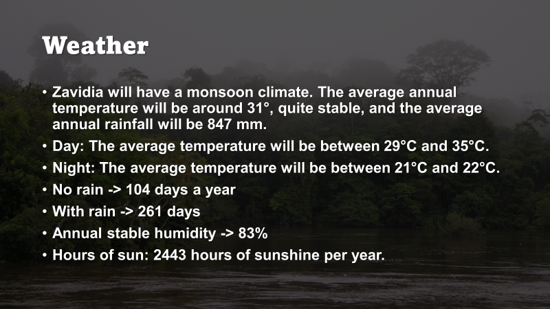 The following climatological data are from the Sipaliwini District, Suriname, a border region and where Zavidia will be located. It should be noted that Sipaliwini is much larger than Zavidia, therefore, these data will surely vary.