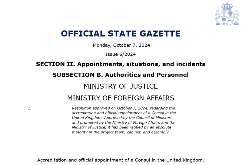 In September, the process of obtaining possible accreditation for an official consulate in the United Kingdom began, although it would be delayed for some time. Finally, on October 7, 2024, Zavidia officially appointed its first official consul not only in the United Kingdom but in its history, Mr. Maher Kheder; who received the Silver Medal for Civil Excellence regarding overseas operations. , in addition to all the Zavidian diplomatic honors.