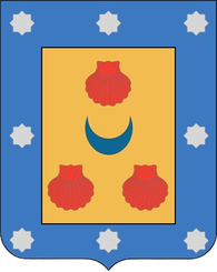 “Or, three scallop shells gules arranged in triangle, and in between them, a crescent azure. Bordure azure, charged with eight estoiles argent. Motto: 'Egija adimen argi hijotzak maite begi' ('Truly the mind loves the light of the eyes'), inscribed in letters gules upon a scroll or. For crest, a crescent azure, with a crow proper perched upon it. For supporters, two foot warriors armed with sabres, holding a lance, from whose shaft hangs a banner argent, charged in its centre with a crescent azure, upon which is perched a crow sable.”